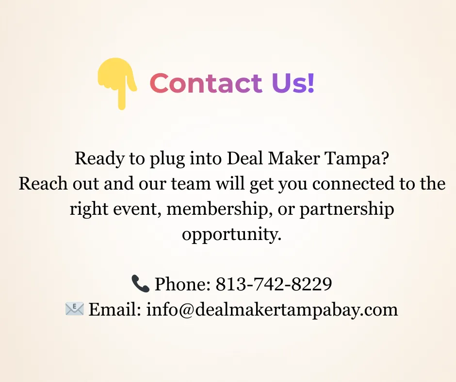 By checking this box, I consent to receive marketing and promotional messages from Deal Maker Tampa Bay, including special offers, discounts, new product updates among others. Message frequency may vary. Message & Data rates may apply. Reply HELP for help or STOP to opt-out.